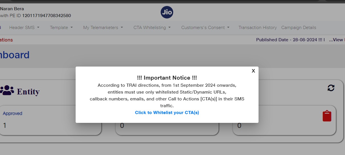 Principle Entity (PE): Ensure URLs, APKs, OTT links, or call back numbers are whitelisted on the DLT portal before sending messages.